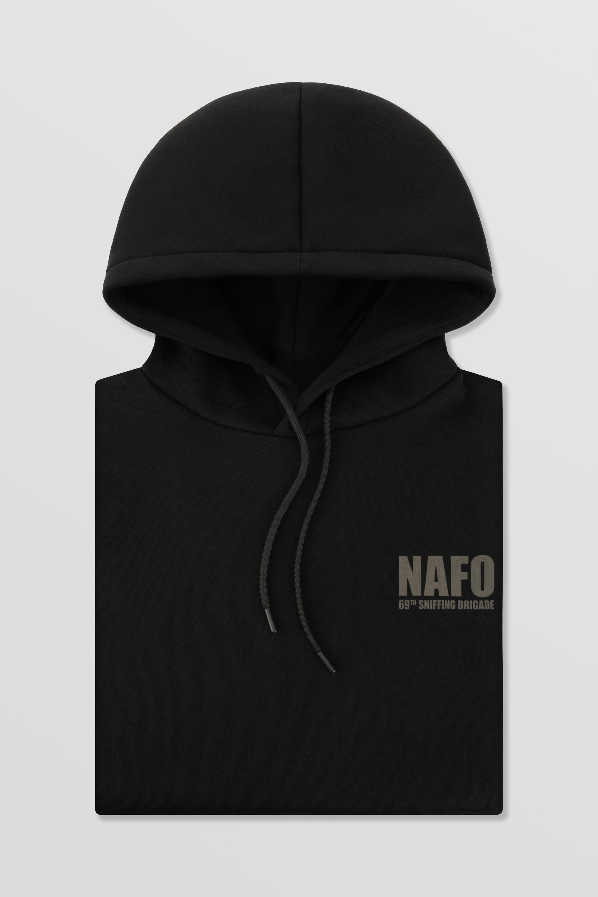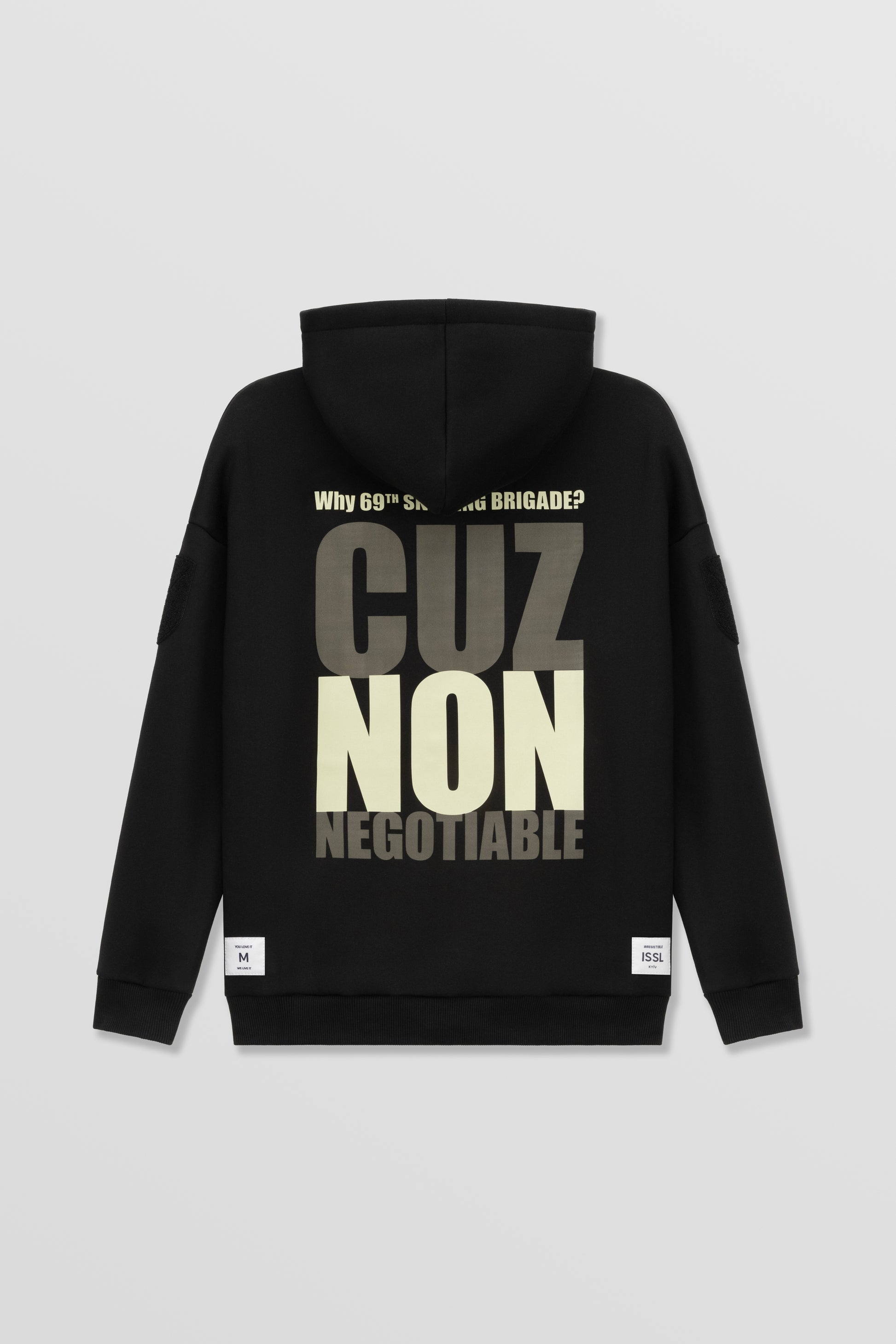 Чорне худі в вільній посадці з шовкотрафаретним друком спереду та ззаду. Подвійний капюшон, велкро на обох рукавах, класична кишеня, фірмові габардинові бірки ISSL. Виготовлено в Україні. 100% прибутку передається 69th Sniffing Brigade.